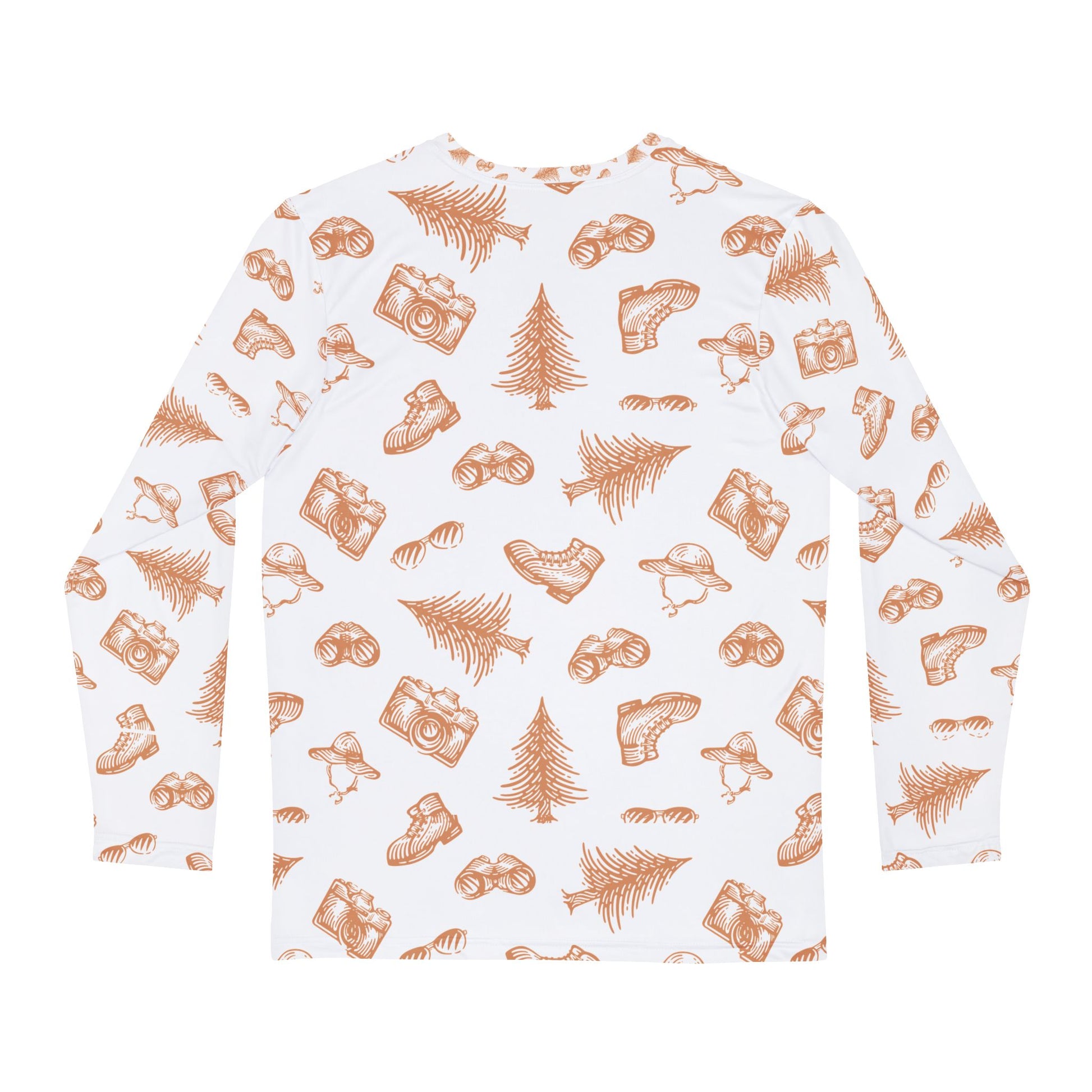 A humorous and fun men's long sleeve shirt designed with Boots, Binoculars, Trees, and Sun hat for guys who aren't afraid to make a statement. Great for those who want to stray away from standard hiking clothes. Perfect for outdoor enthusiasts and adventurers, suitable for hiking trips, camping, and nature lovers.
