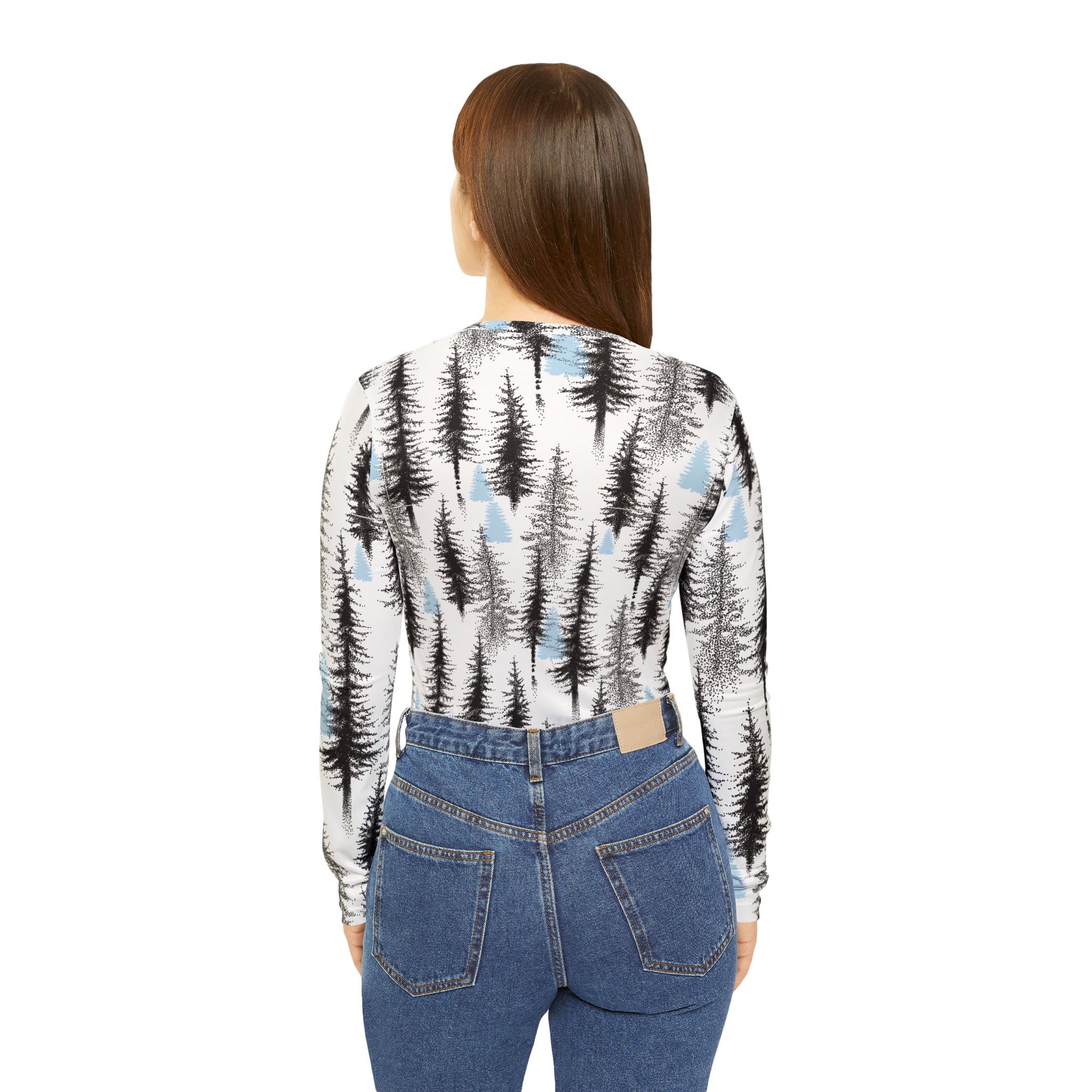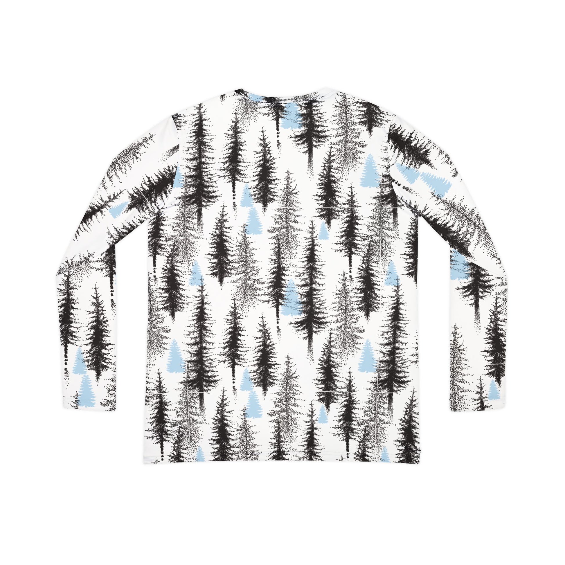 A unique all-over printed long sleeve V-neck shirt featuring a bold design with pine trees and a wolf, perfect for ladies who love nature and animals. This super soft and lightweight polyester-spandex blend shirt is ideal for leisure or activewear, and the double needle stitching ensures durability. The size and care information conveniently printed on the inside collar for easy reference. Seam thread color is automatically matched to the design, making it a stylish and comfortable addition to any nature lover's wardrobe. Relevant for outdoor enthusiasts, animal lovers, and nature lovers. Perfect for casual wear, outdoor activities, camping trips, or as a unique gift for birthdays or holidays like Christmas or Mother's Day.